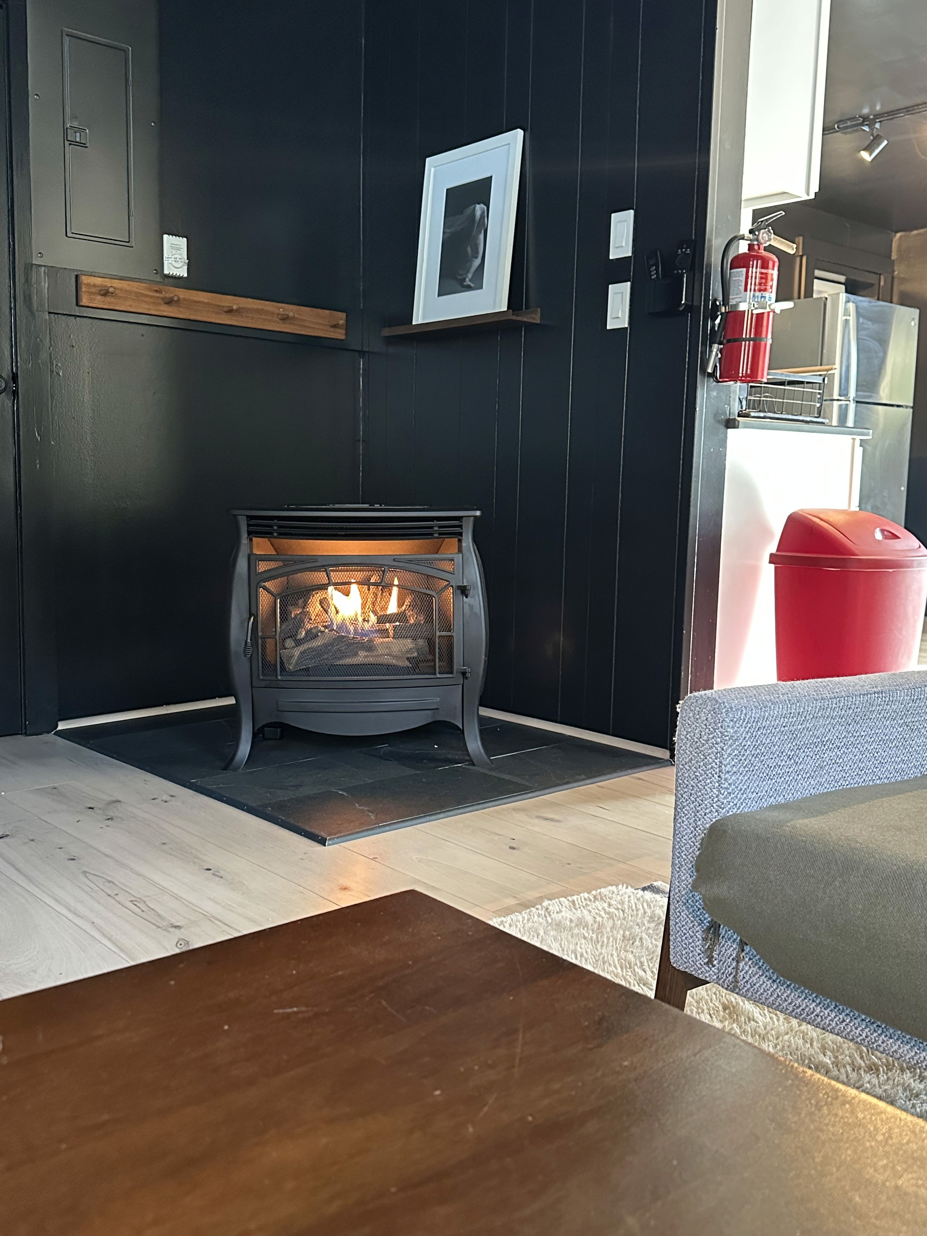 A cozy open-flame fireplace that brings warmth, ambiance, and a comforting focal point to the living space.